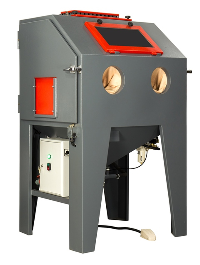 Абразивоструйные перчатки закреплены непосредственно на фронтальной поверхности камеры. Такая конструкция позволяет максимально защитить оператора от вылетающего абразива из камеры, а так же дополнительно герметизирует процесс работ.